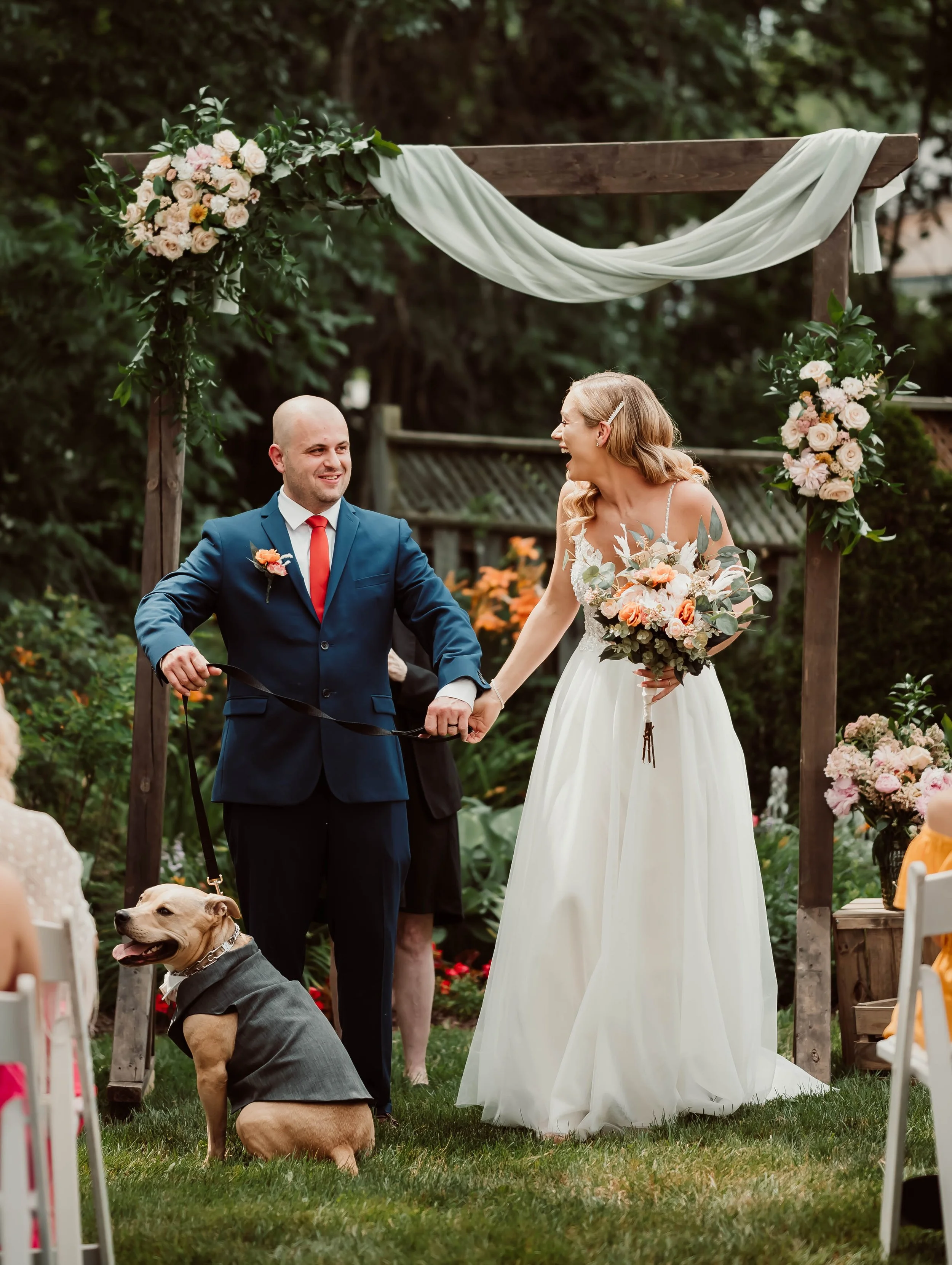 Sarah and Marius' wedding day was filled with love, laughter, and tears of joy (looking at you, mom). Sarah looked stunning in her perfect dress while Marius looked dashing in his navy blue suit. Lets’s be real though, Beans the dog really stole the show! The ceremony took place in a beautiful private garden where the couple exchanged heartfelt vows and sealed their love with a kiss.