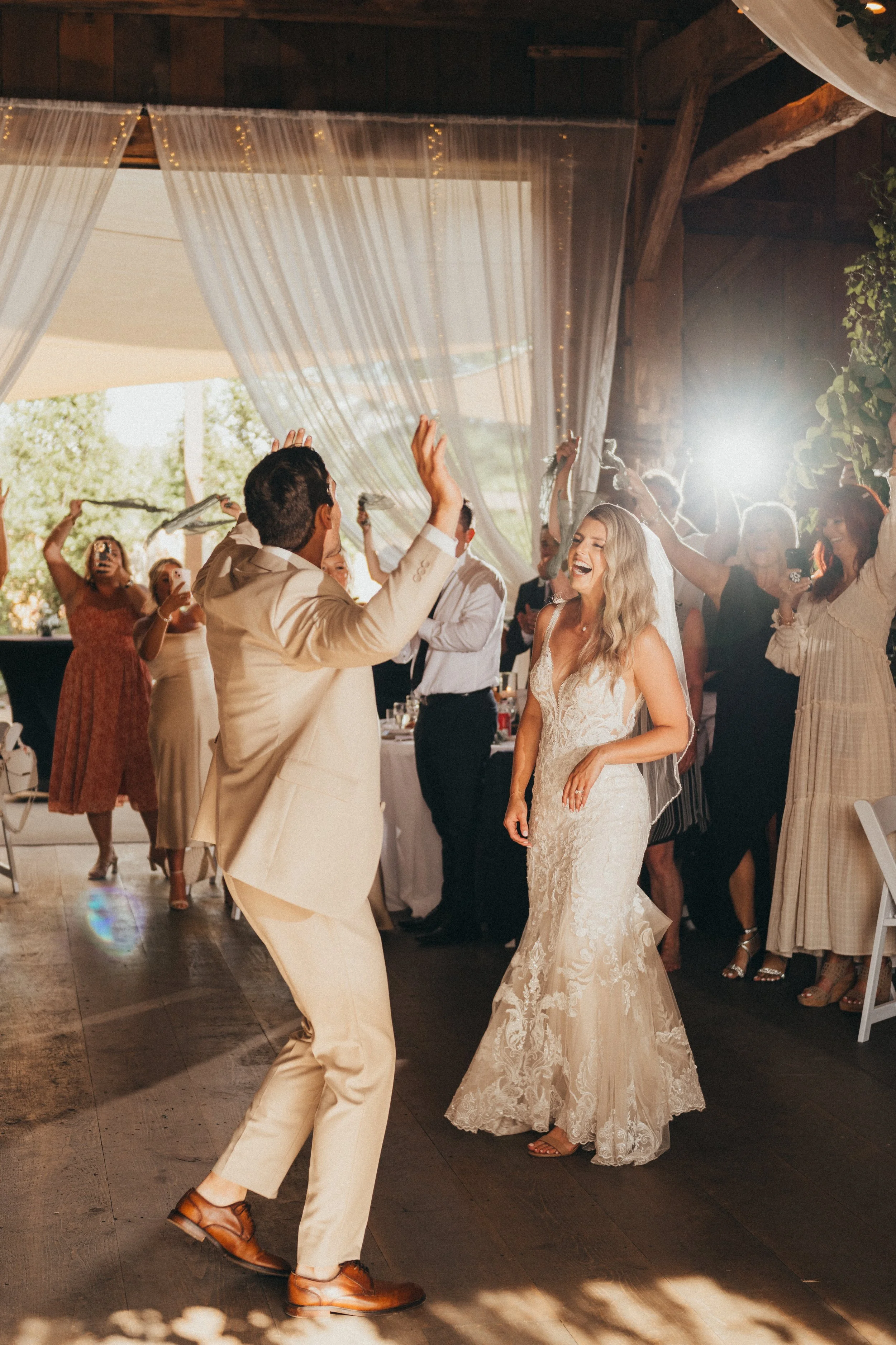 Following the ceremony, guests made their way to the rustic barn for the reception. The barn, adorned with twinkling lights and wildflowers, echoed with joyous conversations and the clinking of glasses. The newlyweds shared their first dance under the warm glow of fairy lights, surrounded by loved ones who had traveled far and wide to celebrate their love.